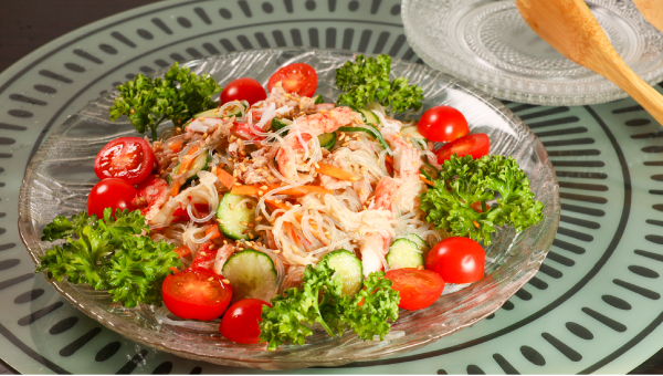 つるんとした春雨に、赤が映えるカニカマとツナ、シャキシャキ野菜を合わせた夏向きのサラダ。冷やしておけば食欲のない日にもさっぱりいただけます。スープなどに加えても美味しく、幅広く活躍する一品です。