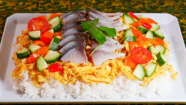 しめさばの酸味と昆布のまろやかさを、軽めの酢飯と合わせてちらし風に。錦糸卵・きゅうり・ミニトマトに、ほんの少量のカラーピーマンを散らすと彩りがぐっと華やかになります。錦糸卵や野菜がやさしくまとまり、サラダ感覚で楽しめる軽いちらし寿司に仕上がります。