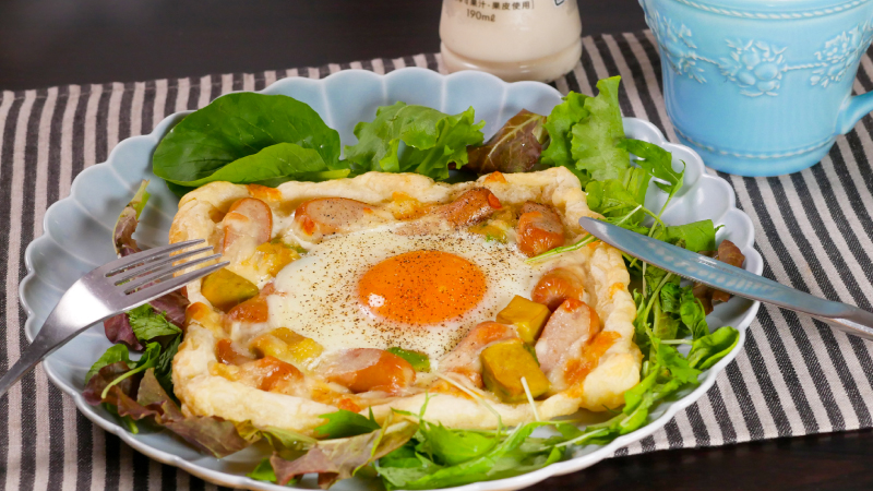 食べやすいひとくちサイズの無塩せきウインナーを使って、カフェ風メニューに。パイシートで作る手軽なガレット風です。卵とウインナー、アボカドをのせ、仕上げにチーズをトッピング。まわりにベビーリーフを添えれば、サラダ感覚で楽しめるワンプレートに。サクサクのパイ生地に、とろ〜り卵とウインナーをからめて召し上がれ。