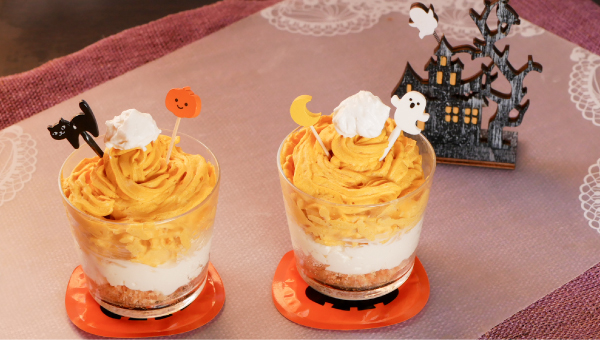 おうちで楽しむハロウィンカップスイーツ🎃かぼちゃのやさしい甘みとクリームチーズのまろやかなコク。混ぜて絞るだけで、手軽に作れる秋のスイーツです。下はビスケットの香ばしさ、中はチーズクリームの軽やかさ、上はなめらかなかぼちゃペースト。層ごとに変わる味わいが楽しいひと品。おばけやかぼちゃのピックを飾って、ハロウィン気分を盛り上げてみてください🎃