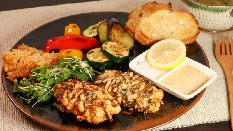 国産の小魚を使用し、1袋(10g)あたりマグネシウム20mg・カルシウム56mgを含む栄養豊富なおやつ。小魚にアーモンドとピーナッツを合わせた、カリカリ食感が楽しい「フィッシュ&ナッツ」です。そのままおやつとしてはもちろん、料理にもおすすめ。今回は、このフィッシュ&ナッツを衣に使った「鶏むね肉の焼き揚げタイプ」をご紹介します。小魚の旨みとナッツの香ばしさが衣に移り、むね肉がしっとりとコクのある味わいに。外はカリッと香ばしく、中はふんわりジューシーに仕上がります。仕上げにレモンをきゅっと絞れば、爽やかな風味が広がり、食欲をそそります。小魚のほどよい塩気がアクセントになり、ごはんが進む一皿です。
