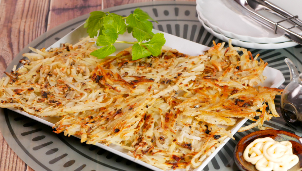 国産小魚とナッツを合わせた“フィッシュ&ナッツ”を、じゃがいものお焼きにアレンジ。カリッと焼いたじゃがいもに、小魚の旨みとナッツの香ばしさが広がります。外はこんがり、中はシャキッとした食感。素材の風味をいかした、軽やかで飽きのこない一品です。