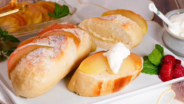 バター入りのバゲットに、りんごのコンポートを重ねて。バターの香ばしさと、りんごの甘酸っぱさがとけ合う、秋のカフェ風バゲットです。外はカリッ、中はふんわり。焼きたての香りに包まれながら、ひと口ごとに広がるやさしい甘み。中のバターフィリングとりんごのコンポートが溶け合い、シンプルなのに贅沢な味わいに仕上がります。生クリームを添えれば、デザートのような特別感も楽しめます。
