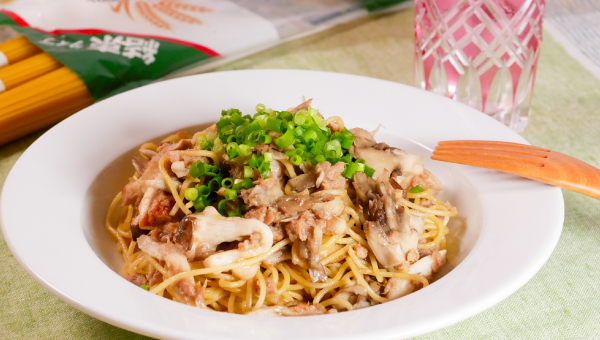 1食分(100g)ずつ束ねてあるから計量いらず。束が崩れず清潔で、保存も簡単です。このパスタを使って、フライパンひとつで作る家庭の定番パスタを。ツナの旨みときのこの香りを、バターのコクとしょうゆの香ばしさで包み込みました。きのこは2〜3種類合わせると香りと食感に奥行きが出ます。ツナのオイルも加えることで、風味豊かに仕上がります。味付けは塩、黒こしょうでシンプルに。忙しい日にもさっと作れる、やさしい味わいのひと皿です。