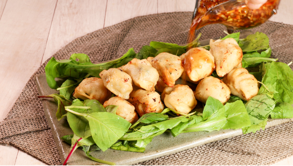 国産豚肉ににらとたまねぎを合わせ、国産小麦の皮で包んだもちもち水餃子。スープに入れると、皮がつるんとやわらかく、噛むほどにお肉の旨みがじゅわっと広がります。白菜や青梗菜、きのこなど季節の野菜をたっぷり加えれば、ボリュームたっぷりのごちそうスープに。添付のチキンスープでやさしい味わいを楽しんだら、仕上げにラー油をひとたらしして、ピリッと大人の味に。