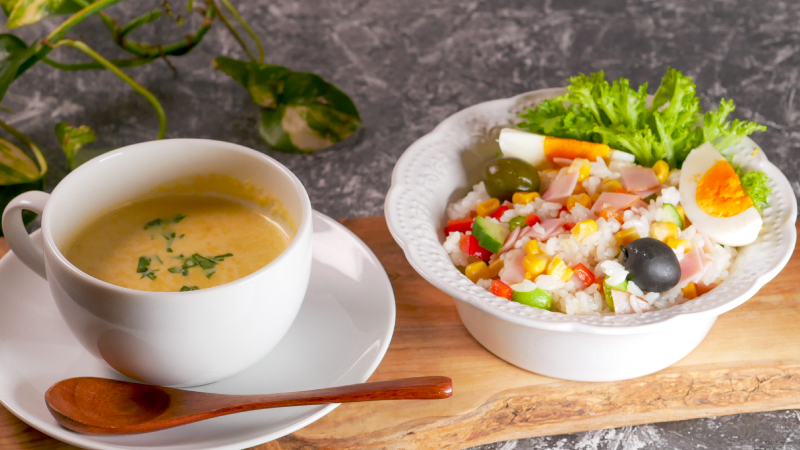 コーンの自然な甘みと食感。蒸してあるので、そのまま手軽に使えます。ぷちっと弾ける枝豆とコーン、色とりどりの野菜とハムを合わせた、ひんやり心地よいライスサラダに、やさしい甘さのコーンスープを添えて。ミキサーで牛乳・生クリーム・コンソメと撹拌し、仕上げにバターを加えれば、コクのある味わいに。温かいスープと冷たいサラダ、“温×冷”のバランスがやさしく調和する夜の食卓にぴったりです。