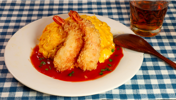 トマトソースとの相性は抜群で、お子さまにも大人気の組み合わせです。とろとろ卵のオムライスにえびフライをのせれば、満足感たっぷりのワンプレートに。手軽に作れる洋食アレンジとして、ぜひ試してみてください。
