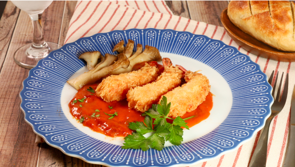 トマトソースに生クリームを少し混ぜたまろやかなソースの上に、えびフライを並べるだけでお店のようなひと皿に。やさしい酸味とコクがえびの甘みを引き立て、シンプルなのに特別感のある一品に仕上がります。赤と青のコントラストが美しく、いつもの食卓が特別な時間に変わります。バゲットを添えて“ちょっとごちそう”を楽しむのもおすすめです。