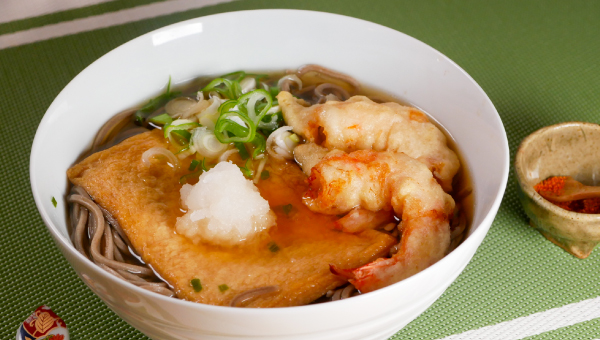 ふっくら大きなお揚げに、サクサクの海老天をのせた豪華なきつねそば。大根おろしを添えてさっぱりと仕上げました。冷凍そばを使えば手軽に作れて、専門店のような味わいに。見た目も食べごたえも十分で、夕食にも、おもてなしにもぴったりの一杯です。