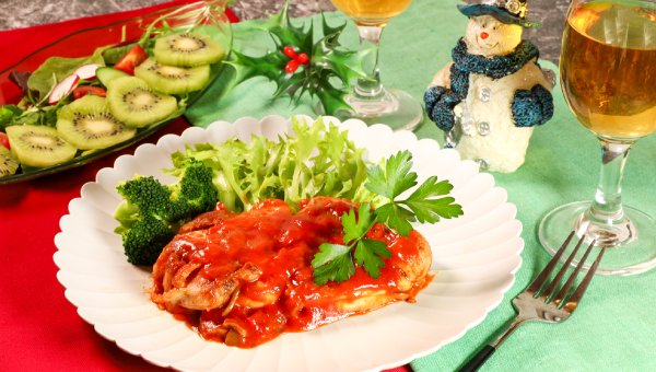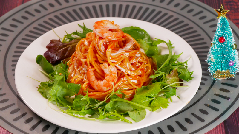 鶏もも肉の皮目をこんがり焼き、赤いソースをまとわせれば、クリスマスの食卓にぴったりの華やかなおかずに。ソテーした鶏肉にナポリタンソースをさっと絡めるだけで、トマトの甘みと旨みが広がる、ごはんにもパンにも合うひと皿に。仕上げにほんの少しバターを落とせば、香りとコクがぐっと深まり、おうちで楽しむ“洋食屋さん風”のごちそうに早変わり。手軽に作れて見栄えも良く、クリスマスのテーブルを華やかに彩ります。