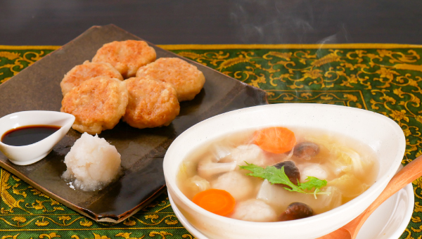 作り方は簡単。白玉粉と豆腐を混ぜ、耳たぶ程度のやわらかさにしたら、鶏ひき肉・塩・しょうゆ・しょうがを加えてよくこねます。一口大に丸めて沸騰した湯で茹で、浮いてから1〜2分ゆでて取り出します。スープに入れるのはもちろん、ごま油で両面こんがり焼いてポン酢や大根おろしを添えるのもおすすめ。お餅よりやさしく柔らかな食感を、ぜひお試しください。