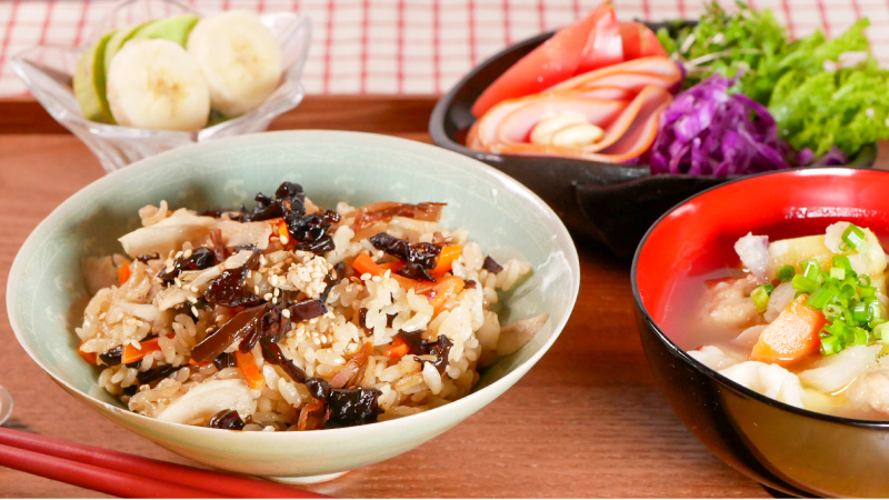 忙しい日でも炊飯器まかせで簡単にできる、やさしい味わいの炊き込みごはん。九州産きくらげ、国産ごぼう、高知県産しょうが、鹿児島県枕崎製造のかつお節で作った佃煮を使っています。佃煮の甘辛だれがご飯全体にしみ込み、かつおの旨みとごぼうの食感が広がります。冷めても美味しく、やさしい味わいが魅力です。撮影後の試食では、仕上げに生姜の千切りを少し添えると、さわやかな香りが加わってよりおいしく感じられました。油揚げやまいたけを加えると、さらに風味豊かに仕上がります。