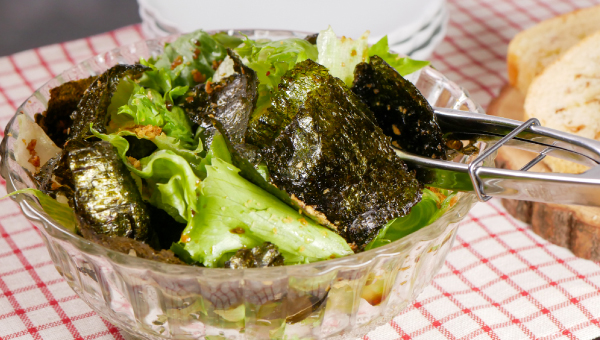 ちぎったレタスにのりを散らすだけの簡単サラダ。ドレッシング次第で和風にも洋風にもアレンジできます。ツナやじゃこを加えれば栄養バランスもアップ。今回はオリーブオイルとしょうゆを回しかけ、仕上げにフライドガーリックをトッピング。パリッとしたのりの食感と香ばしさが絶妙で、レタス丸ごと食べられそうな美味しさです。手軽に作れて、食卓に彩りと楽しさを添えてくれる一皿です。