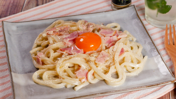 うどんで楽しむカルボナーラ!もちもちのうどんに濃厚なカルボナーラソースをからめた洋風アレンジ。パスタとはひと味違う食感が新鮮で、意外と食べやすいのも魅力です。コクのあるソースがうどんによく絡み、お子さまから大人まで楽しめるクリーミーな一皿です。