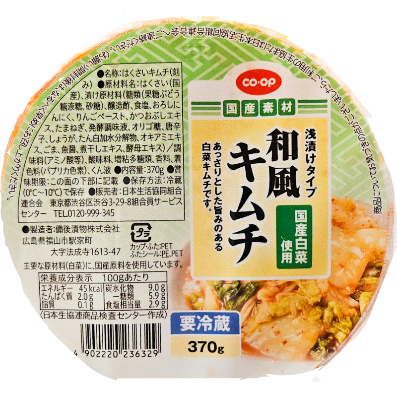 CO・OP 和風キムチ 370g 2025.11.01 夕食 家飲み 料理 閲覧数:0 JAN:4902220236329保存方法:冷蔵(0℃~10℃)内容量:370g 調理のポイント 開封後はなるべく早めにお召し上がりください。