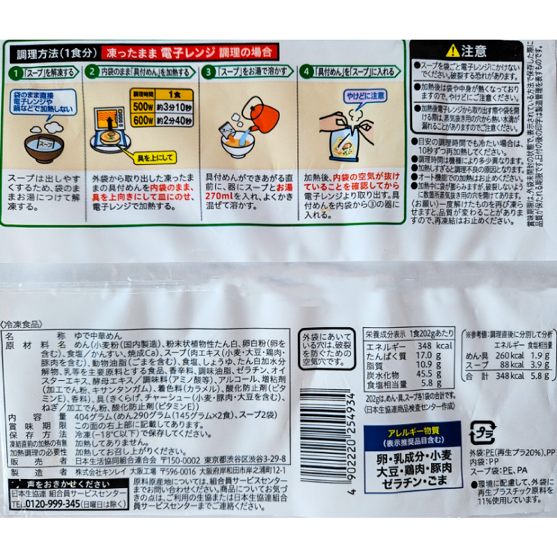 ・外袋から取り出した凍ったままの具付きめんを、内袋のまま具を上向きにして皿へ。