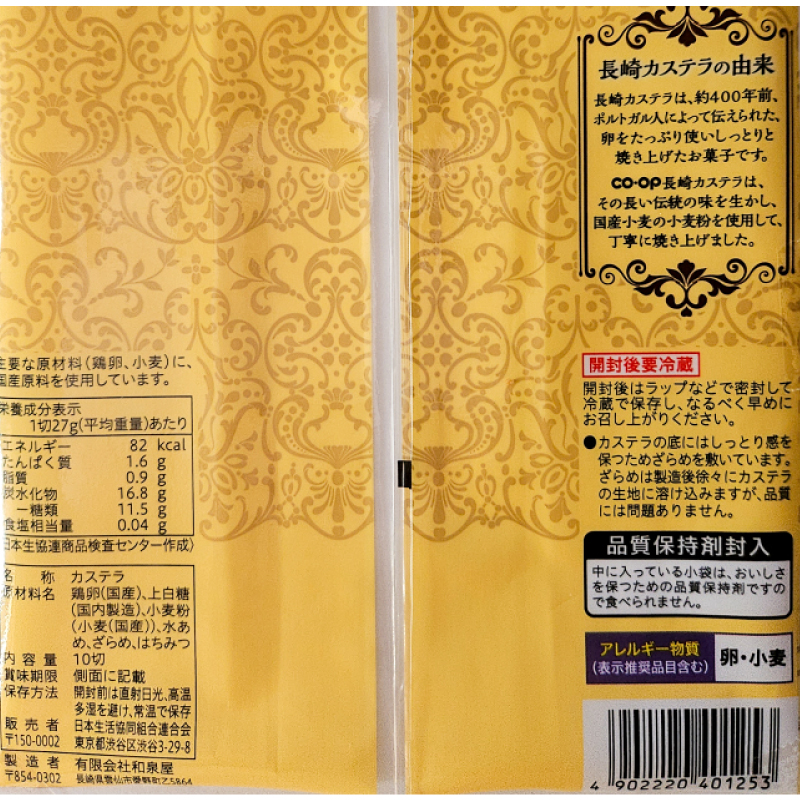 カステラの底にはしっとり感を保つためざらめを敷いています。ざらめは製造後徐々にカステラの生地に溶けこみますが品質には問題ありません。